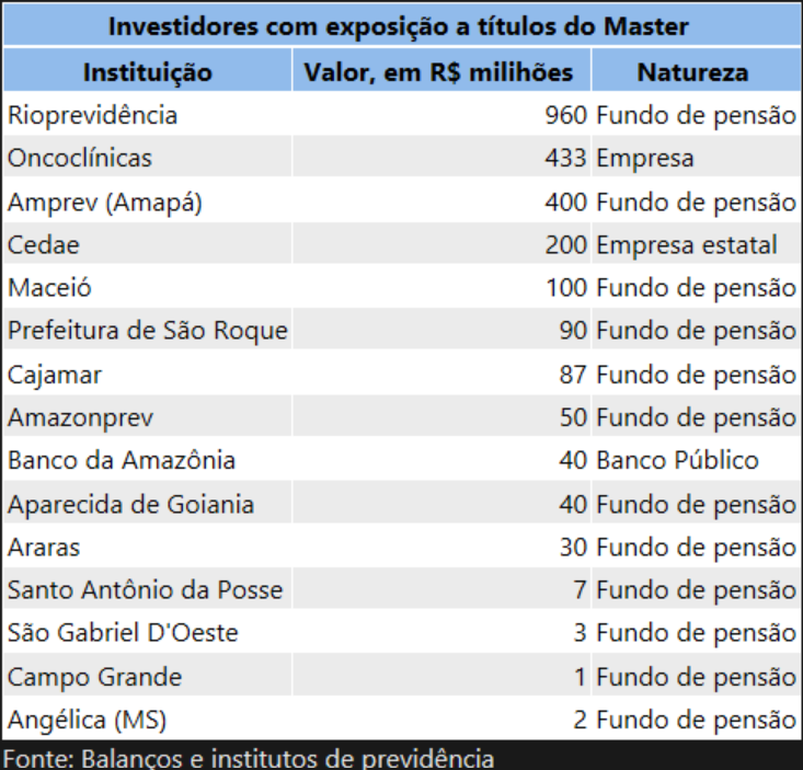 A maior exposição às letras do Banco Master está concentrada na entidade de previdência dos servidores do Estado do Rio de Janeiro. O Rioprevidência aplicou cerca de R$ 1 bilhão nos papéis. Em seguida, está o fundo de pensão do Estado do Amapá (Amprev), com R$ 400 milhões.