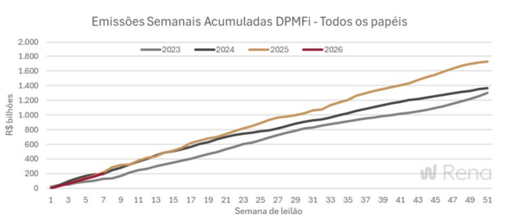 Head de política fiscal do Santander, Ítalo Franca lembra que o Plano Anual de Financiamento (PAF) de 2026, divulgado pelo Tesouro no final de janeiro, estima a necessidade líquida de financiamento do governo federal em R$ 1,678 trilhão, montante quase 15% superior ao observado em 2025. Em seus cálculos, implica uma necessidade de emissões da ordem de R$ 33 bilhões por semana para manter o controle do colchão de liquidez, sendo que o registrado até agora ficou em ritmo próximo, de cerca de R$ 31 bilhões.